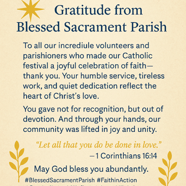 Con todo el cariño, queremos agradecer a nuestros increíbles voluntarios y feligreses que hicieron posible el festival de este año. Su servicio humilde, trabajo incansable y entrega silenciosa reflejan el amor de Cristo en acción.